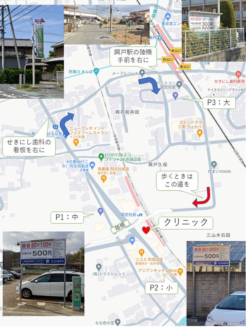 コインパーキングご案内 投稿日:2026.01.28 P1はクリニック前の陸橋の北西、カフェ「Edu DOSHISHAMAE」の隣にあります。 P2はファミレスのココスの南にありますが、小さめです。 P1とP2は満車のことがあります。 P3は空いていますが、6分ほど歩いていただく必要があります。