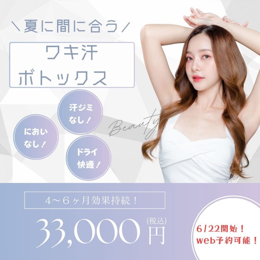 ワキ汗対策のボトックス(ボツラックス)注射を6/22から開始します。なんとか夏本番前に間に合いました! 価格は33,000円(税込)です。お問い合わせは080-2080-0250まで!