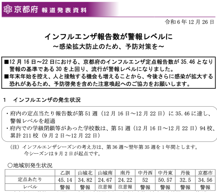 京都府感染症情報センターから「インフルエンザの定点報告数が基準である30を上回ったため、流行が警報レベルとなった」と発表されました。今後さらに感染が拡大する可能性があるため、予防対策を含めた注意喚起が強く呼びかけられています。