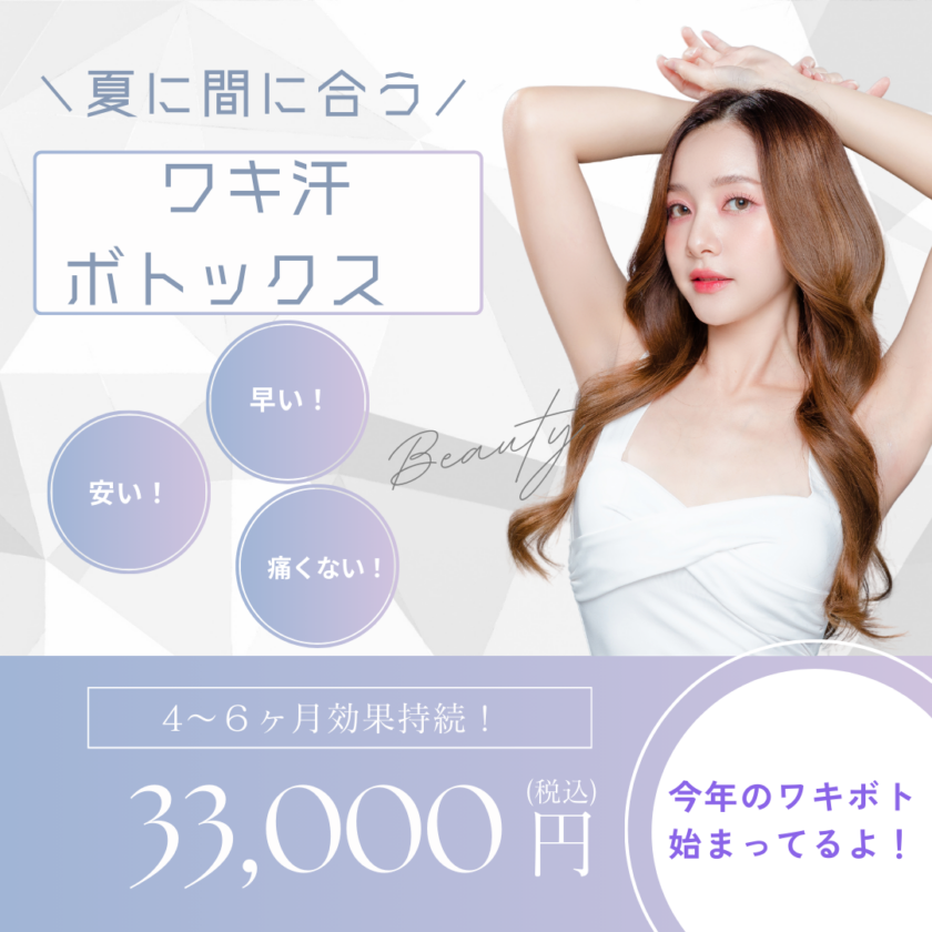 ワキ汗ボトックス、いかがですか? 投稿日:2025.04.11 ワキ汗対策のボトックス注射の需要が多くなる季節となりました。 これからの季節はコーディネートを組むにもワキ汗対策を考えなければいけませんよね。 ワキ汗ボトックス注射を受ければ、ワキ汗が減り暑い夏をより快適に過ごすことができます。 イヤな臭いも軽減できます。 受診していただければ、副作用の危険を含めてキチンと診察・説明するようにいたします。